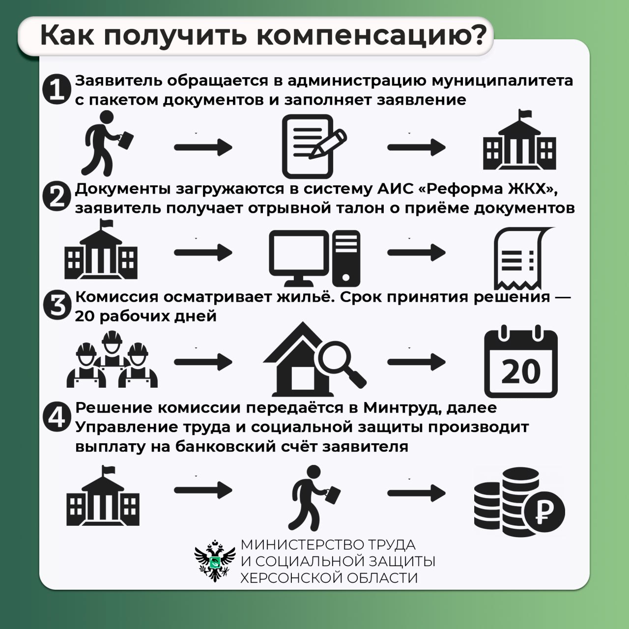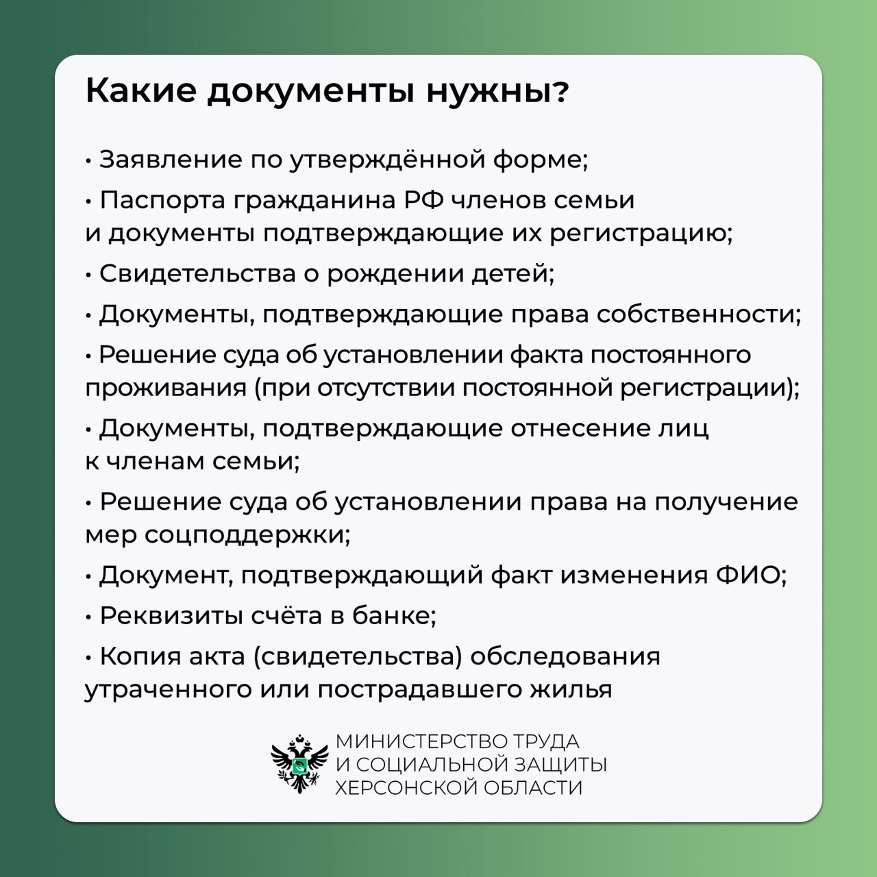 Для подачи документов обращайтесь в администрации муниципальных округов (https://t.me/mintrud_kherson/7194) по месту проживания.