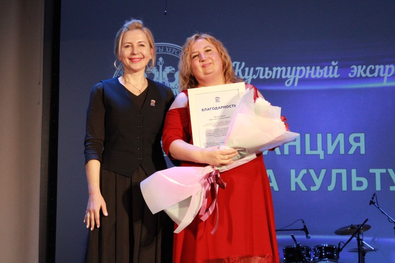 Также благодарностью первого заместителя Председателя Херсонской областной Думы, члена фракции «Единая Россия» Елена Дмитрук отмечена Кристина Иноземцева — начальник отдела культуры, туризма, спорта и молодёжной политики, секретарь первичного отделения партии «Единая Россия». Благодарность вручена за активное участие в организации и проведении мероприятий, значительный вклад в развитие культуры и творчества в Херсонской области, а также в связи с Днём работника культуры Российской Федерации.