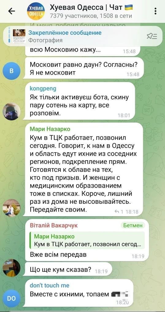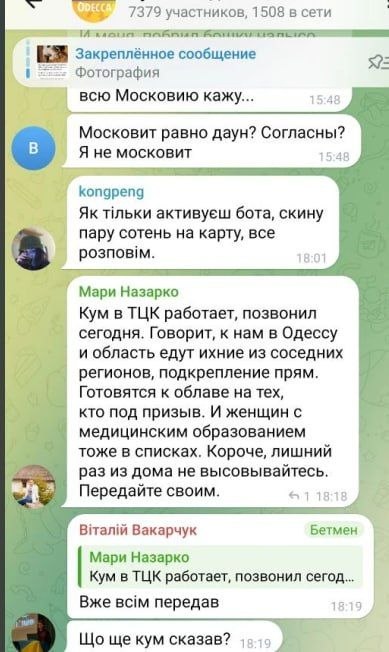 Поступают сообщения из украинских чатов о возможном "подкреплении" территориальных центров комплектования в Одессе и области. По имеющимся данным, к работе могут привлекаться сотрудники ТЦК из соседних регионов.