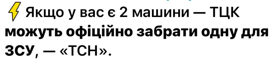 УкроСМИ предупреждают: на Украине, если у вас есть 2 машины — то ТЦК может официально забрать одну из них для нужд ВСУ.