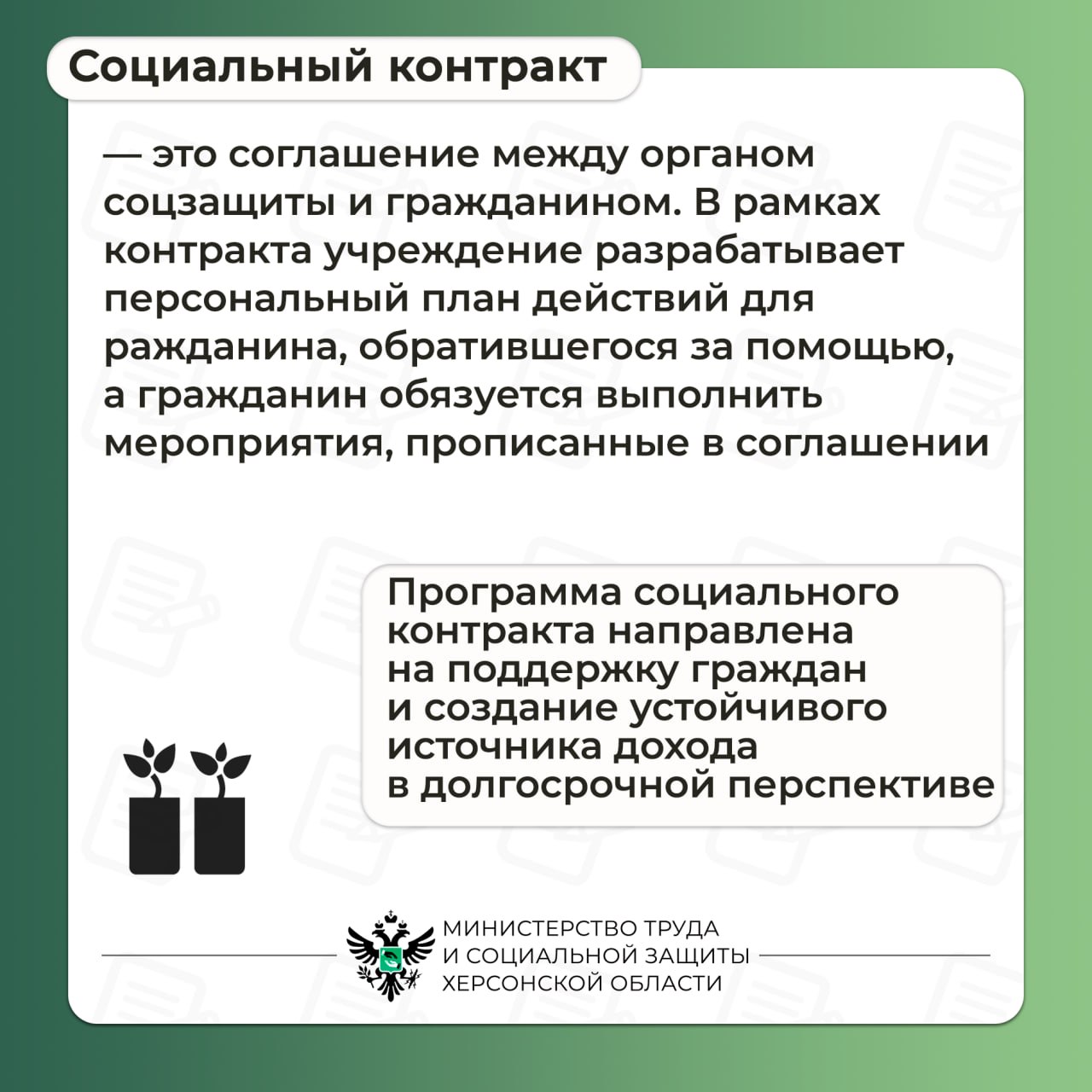 Сегодня социальный контракт — это работающий инструмент преодоления кризисной ситуации. При его помощи человек сам повышает уровень своей жизни и членов своей семьи.