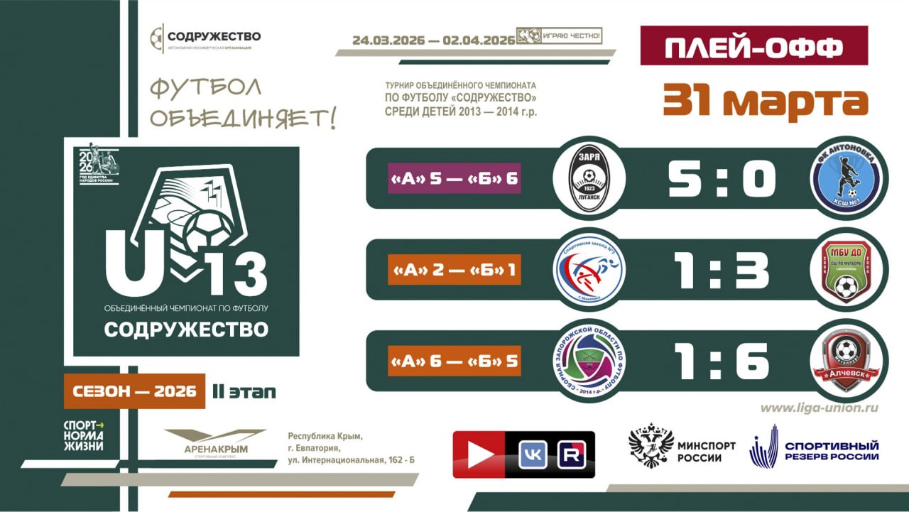 31 марта 2026 года в г. Евпатория состоялись матчи стадии плей-офф II этапа турнира Объединённого чемпионата по футболу «Содружество» среди детей 2013-2014 годов рождения (U-13).