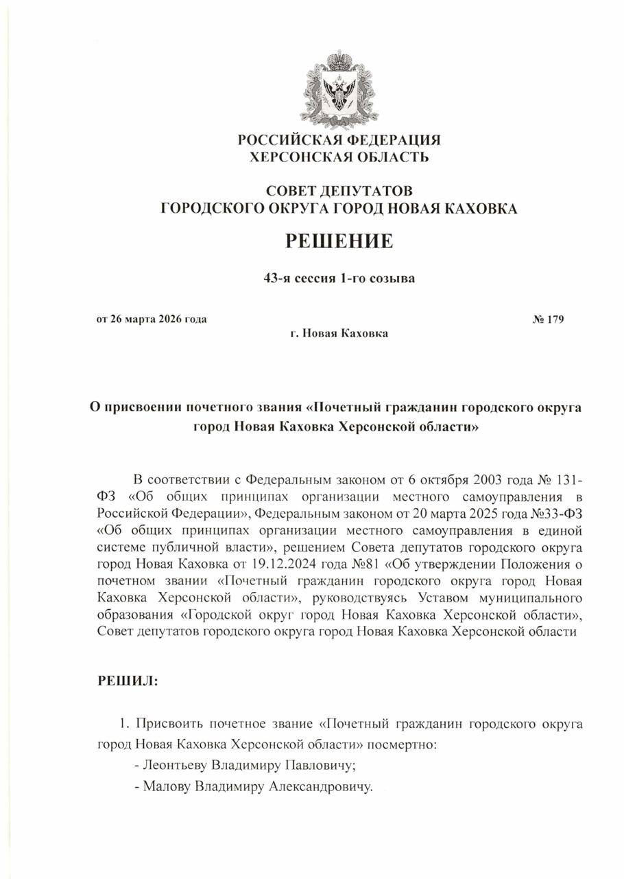 Совет депутатов городского округа принял решение о присвоении звания Почетных граждан посмертно бывшему главе муниципалитета Владимиру Леонтьеву и бывшему исполнительному секретарю новокаховского отделения "Единой России" Владимиру Малову.