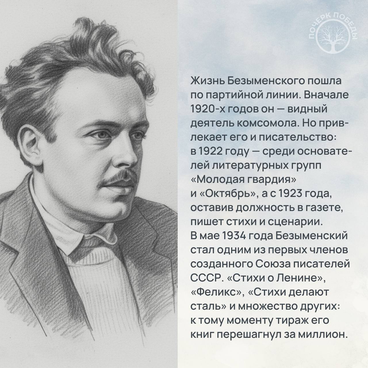 В 39-й главе мы расскажем про Александра Безыменского. Еще юношей он оказался в рядах партии Ленина, а в 21 год стал участником Октябрьской революции в Петрограде. Однако работу в Комсомоле совмещал с любимым делом - писательством.