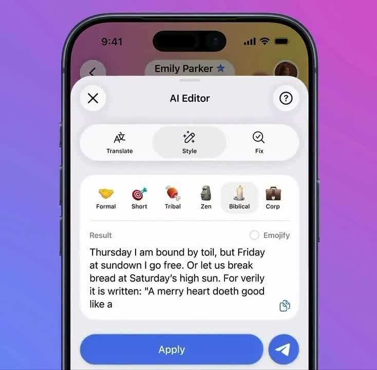В Telegram появился ИИ-редактор сообщений, который умеет переписывать тексты в разных стилях и переводить его на другие языки.