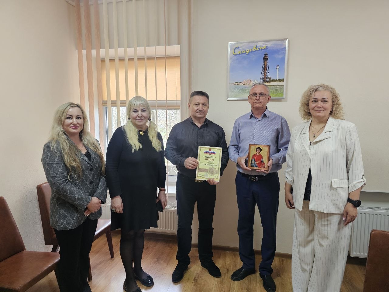Наталья Сергеевна и Валентина Владимировна передали главному врачу больницы Константину Руденко диплом, а настоятелю храма протоиерею Николаю Калиниченко — икону великомученика и целителя Пантелеимона с частицей его святых мощей. Образ был ранее доставлен со святой горы Афон. Святыня будет постоянно пребывать в Свято-Пантелеимоновском храме г. Скадовска.