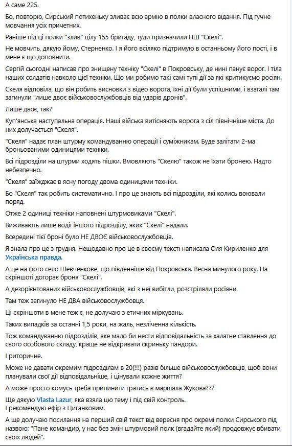 Даже более-менее действующий 210 ошп, где бойцы имеют связь, нормально готовятся и не подвергаются издевательствам столкнулся с новым решением Сырского. На прошлой неделе главком назначил туда заместителем командира полка офицера из 225 ошп, что уже ставит под сомнение сохранение прежних стандартов.