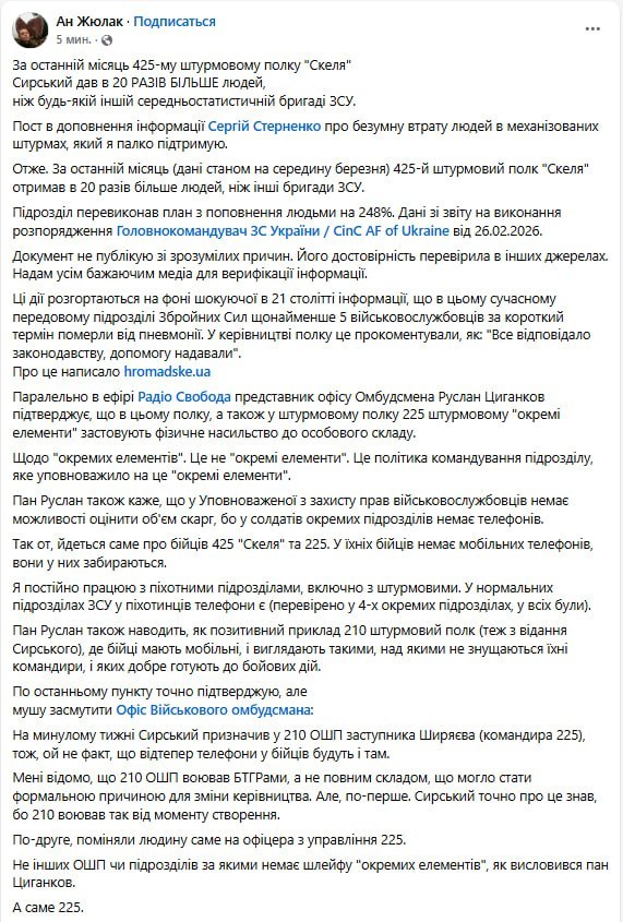 Подобные методы усиления боеспособности отдельного подразделения выглядят не как что-то частное, а как системная политика командования во главе с Сырским. При этом сами методы боевой подготовки оставляют желать лучшего. Оценить масштаб жалоб со стороны захисников сложно, поскольку у бойцов этих подразделений часто отсутствуют мобильные телефоны — их изымают. В обычных пехотных частях ВСУ такая практика не встречается так часто.