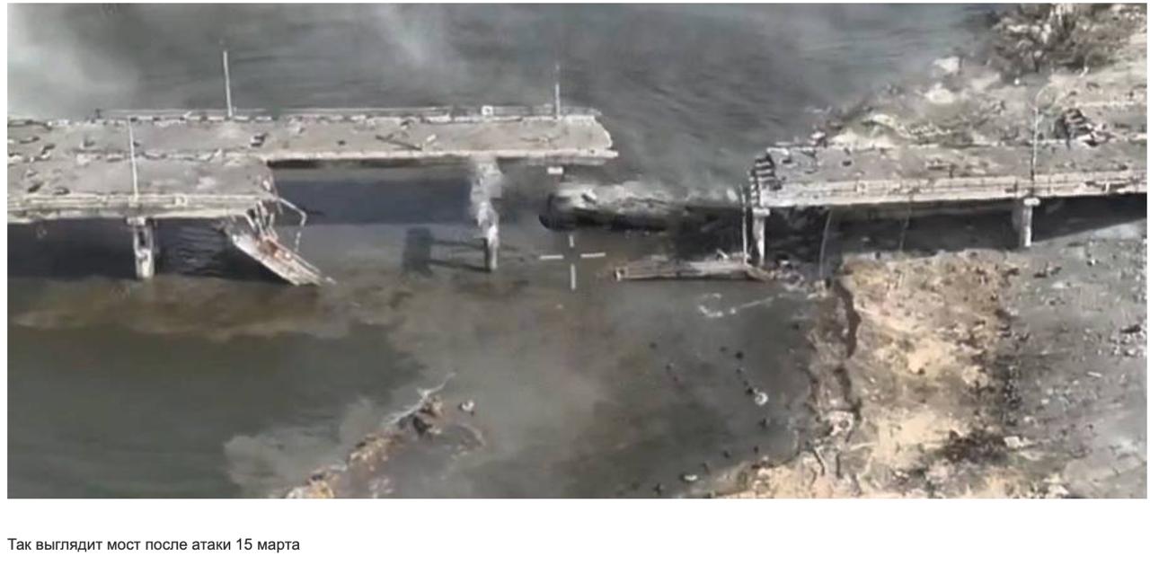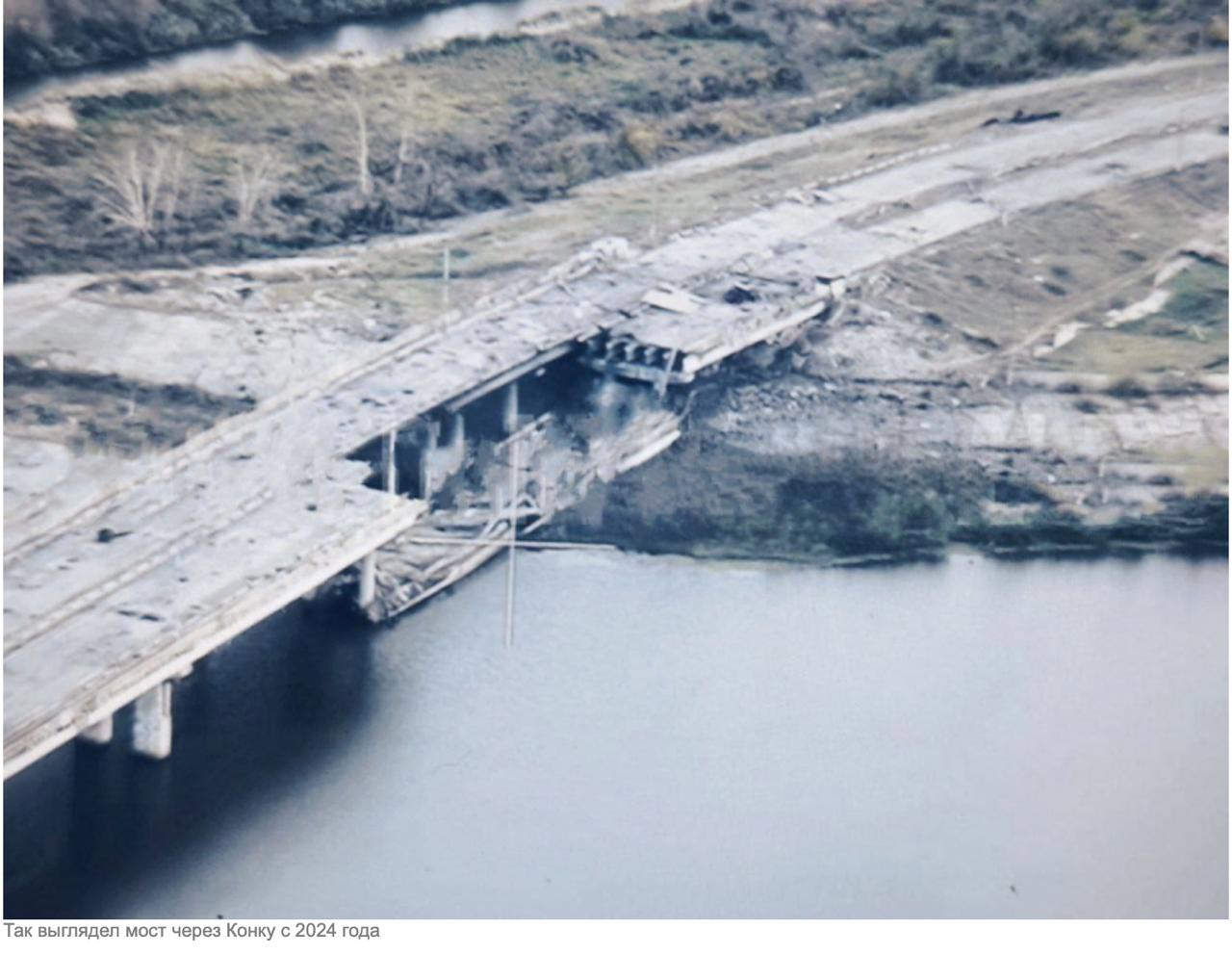 Это, мягко говоря, преувеличение. Упомянутый мост был практически разрушен еще в октябре 2024 года. Причем украинские пропагандисты тогда утверждали, что это сделали русские. Вот, к примеру, цитата из Обозревателя: «Мост был уничтожен из-за страха оккупантов перед контрнаступлением украинских защитников на Херсонском направлении».