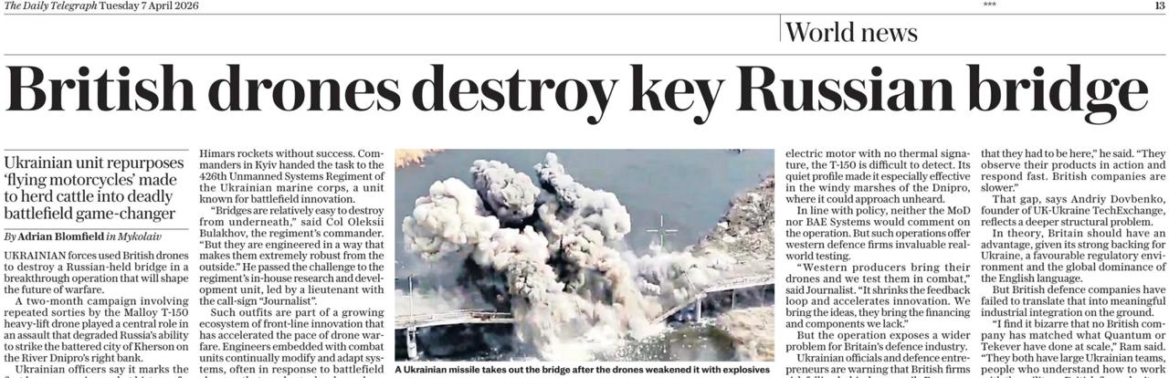 The Daily Telegraph вообще преподносит это как «переломный момент в войне»: «Украинские войска использовали британские беспилотники для уничтожения удерживаемого Россией моста в ходе прорывной операции, которая определит будущее военного искусства». Во как!