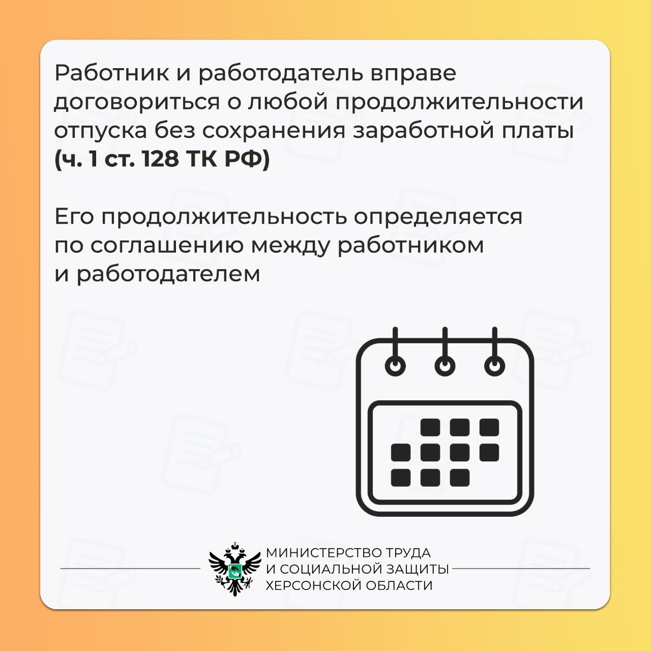 Работник и работодатель вправе договориться о любой продолжительности отпуска без сохранения заработной платы (ч. 1 ст. 128 ТК РФ). Его продолжительность определяется по соглашению между работником и работодателем.