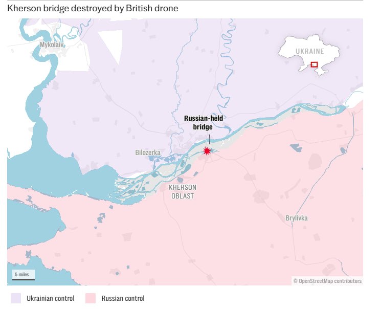 ВСУ применили тяжелый британский БПЛА Malloy T-150 для уничтожения моста в Херсонской области. В течение нескольких месяцев хохлы пытались уничтожить его с помощью авиаударов и Himars, но в конечном итоге задействовали более легкое средство. А именно просто доставку взрывчатки на беспилотнике.