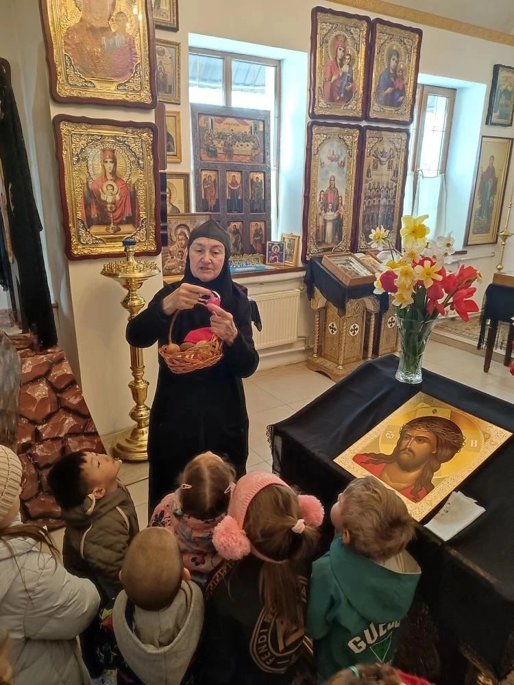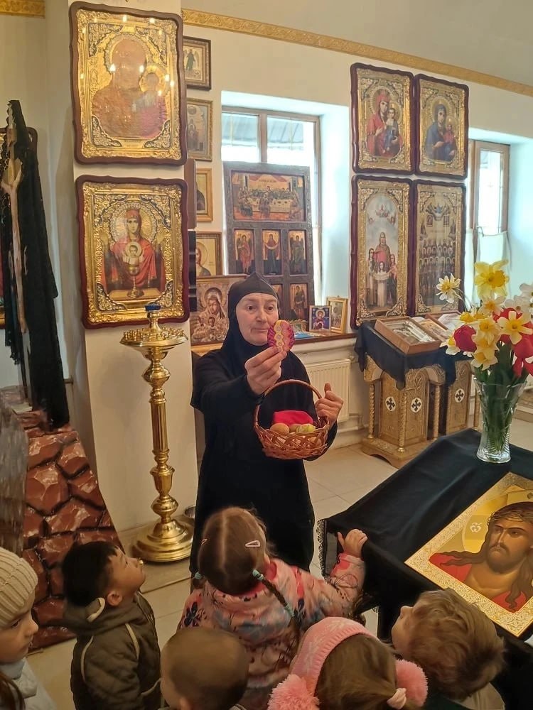 Игуменья Калисфения рассказала малышам об истории возникновения православного праздника Пасхи — Светлого Христова Воскресения, а также поделилась секретом рецепта вкусного пасхального кулича. Дети с интересом слушали рассказ о традициях праздника и узнали, как готовятся главные пасхальные угощения.