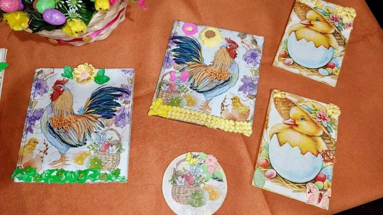 На выставке представлены изделия, выполненные в технике декупаж: пасхальные яйца, декоративные тарелки, шкатулки и панно. В каждой работе чувствуется старание и тёплое отношение к тому, что создаётся своими руками. Выставка получилась по-настоящему светлой и живой, отражающей радость пасхального торжества.