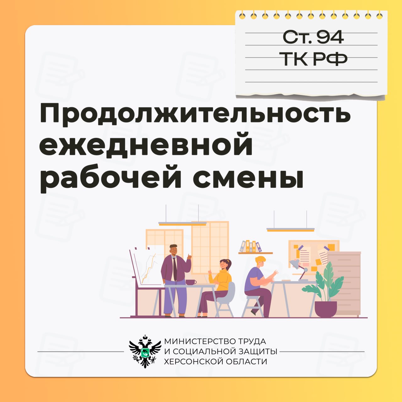 Нормальная продолжительность рабочего времени — это 40 часов в неделю (ст. 91 ТК РФ). Продолжительность рабочей смены для разных категорий сотрудников определяет ст. 94 ТК РФ.