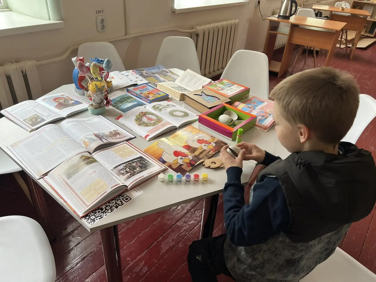 Под чутким руководством библиотекаря ребята учились расписывать пасхальные яйца. Дети проявили настоящую фантазию: на скорлупе появились яркие узоры, весёлые смайлики и затейливые орнаменты. В завершение встречи юные художники устроили мини-выставку своих творений прямо в читальном зале. Яркие расписные яйца создали в библиотеке по-настоящему праздничное настроение. Все участники получили сладкие угощения и памятные сувениры.