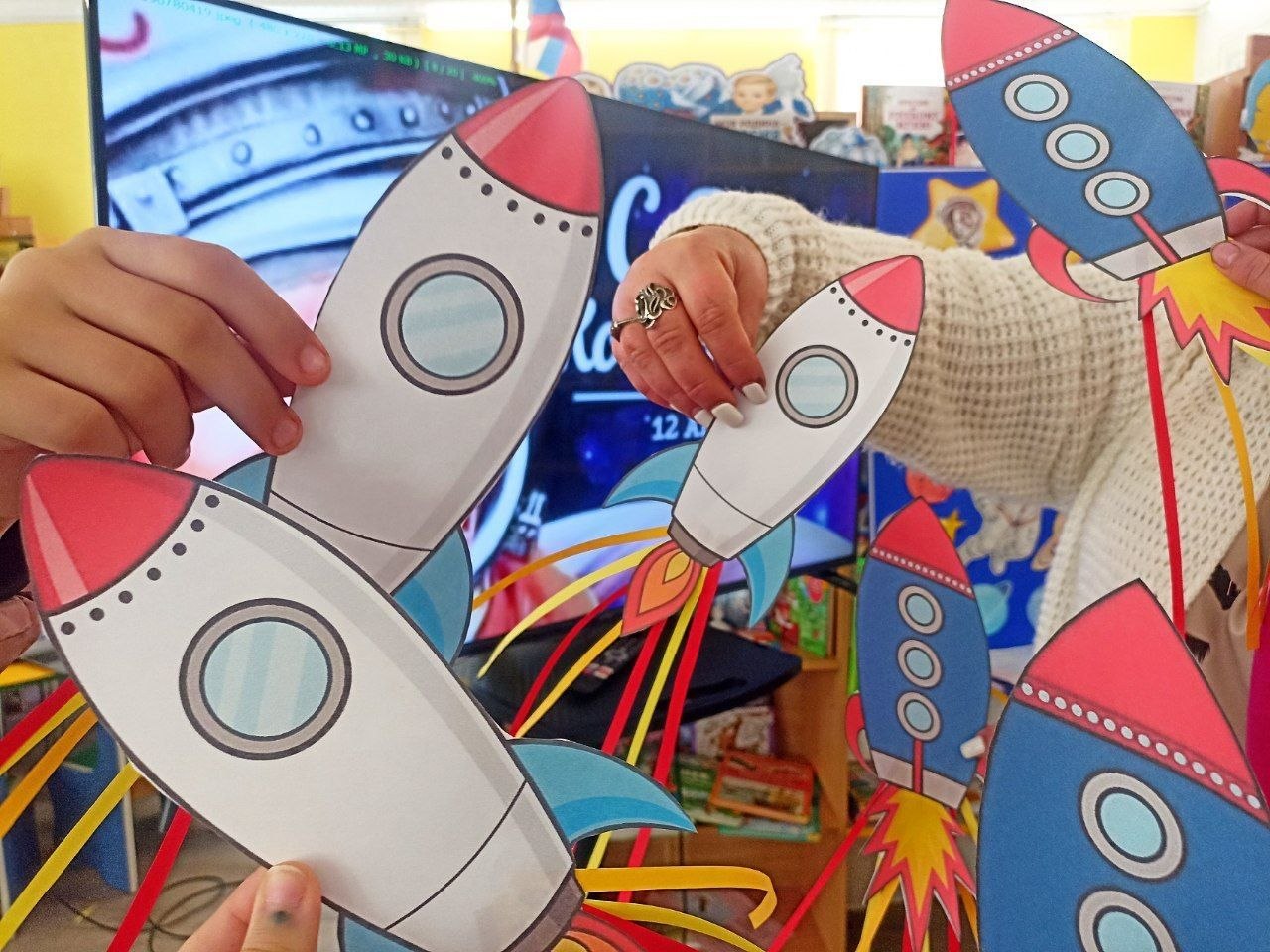 В завершение встречи прошла космическая викторина и мастер-класс по изготовлению ярких ракет из картона.