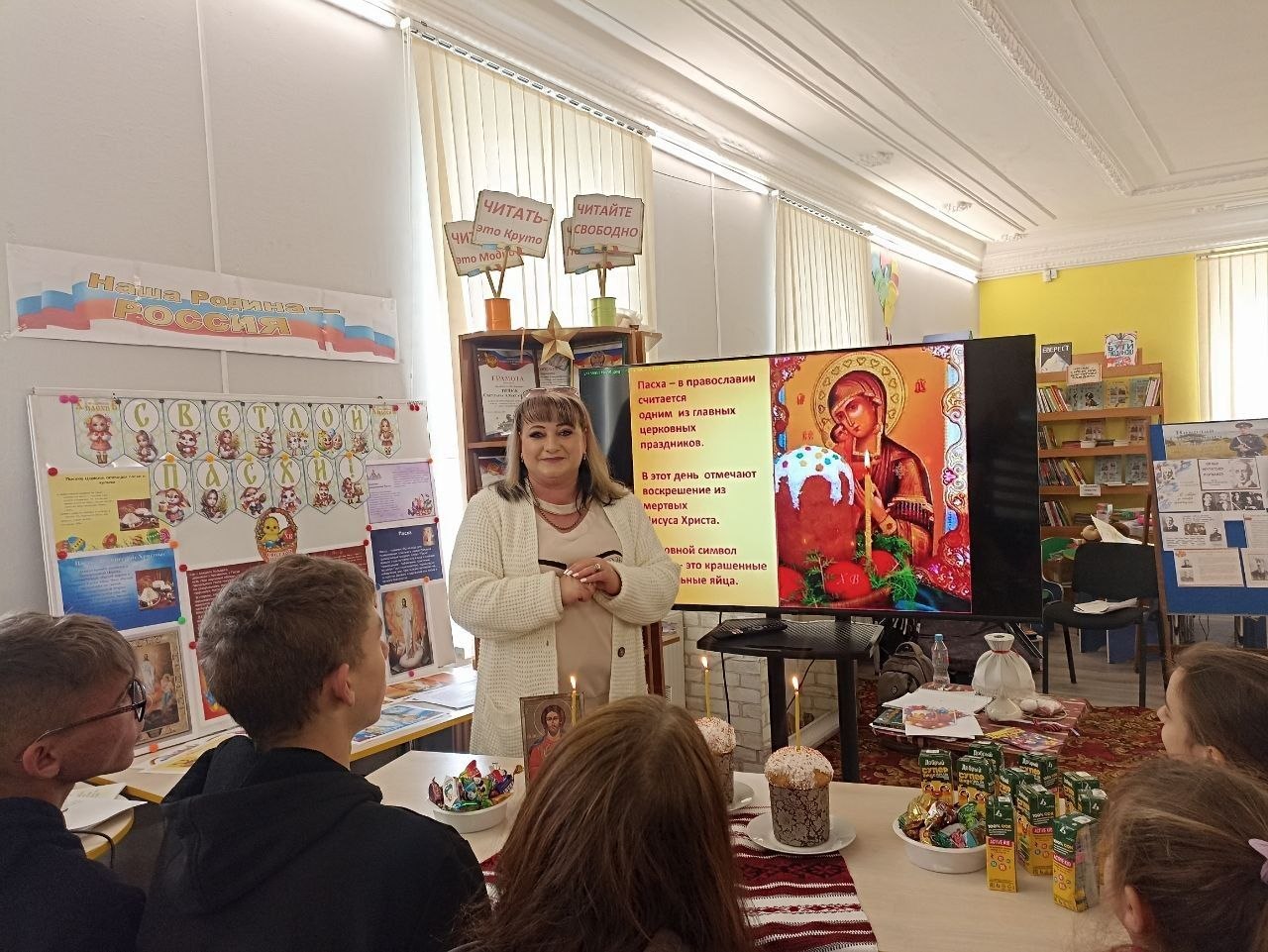В ходе встречи юные посетители познакомились с историей праздника, народными поверьями, а также с пасхальными традициями и обычаями наших предков, сохранившимися до наших дней.