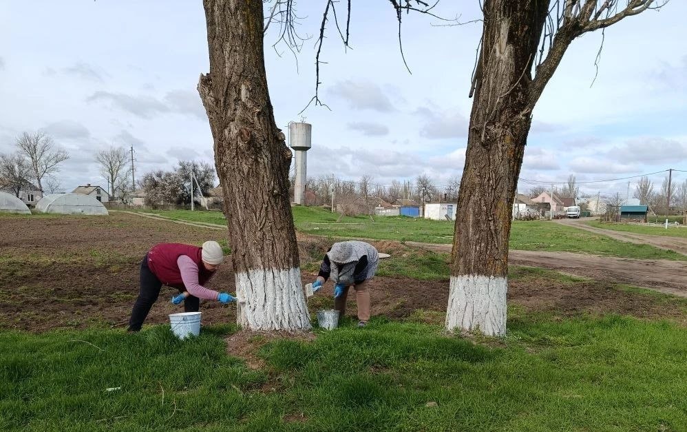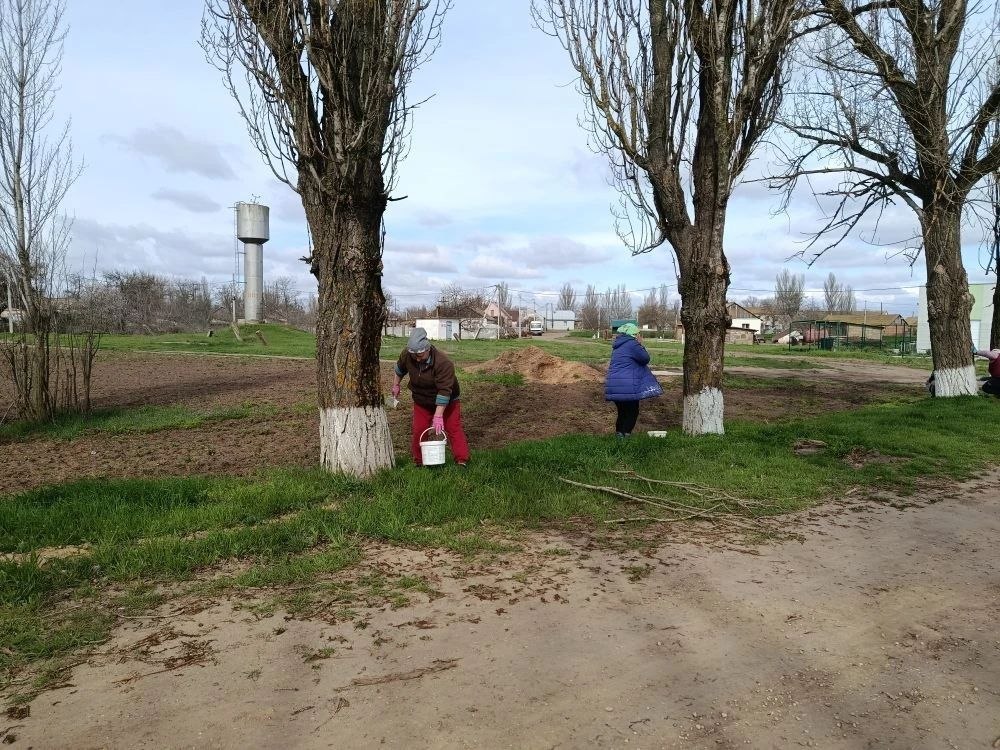 Побелили деревья по улице Школьной, в центре села, а также около административного здания ТУ «Таврия». Провели уборку и покос травы на территории сельского кладбища, а также уборку у памятника участникам Великой Отечественной войны в селе Таврия.