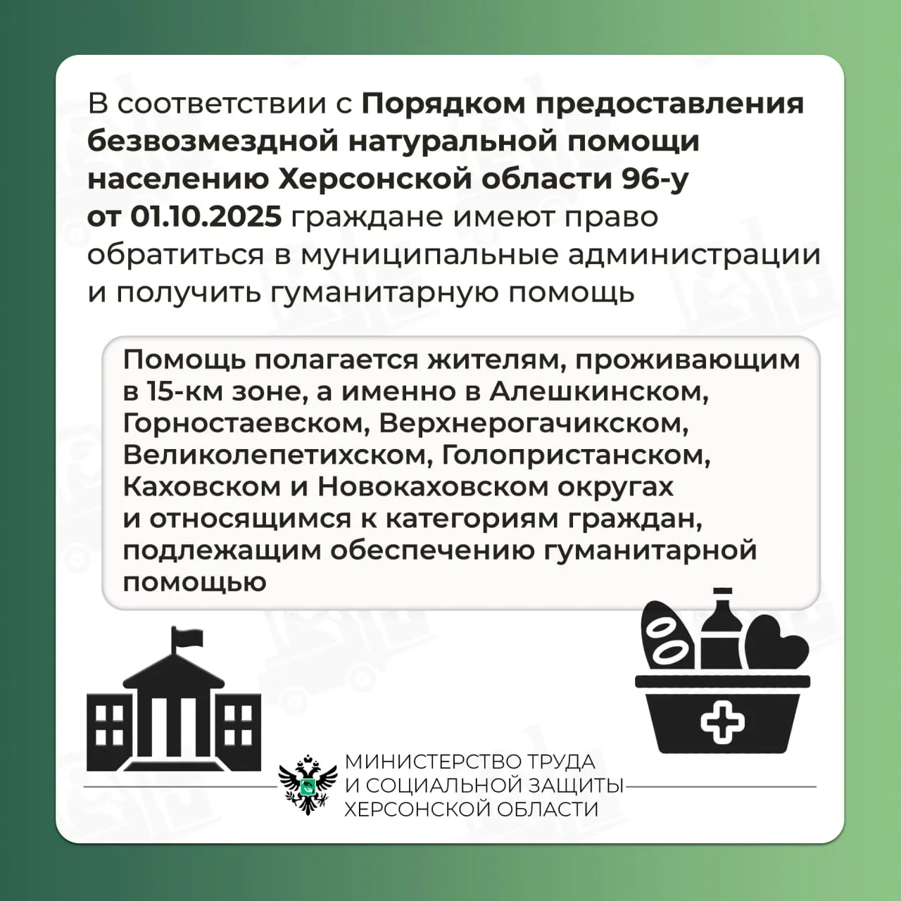Помощь положена жителям, которые живут в 15-километровой зоне — это Алёшкинский, Горностаевский, Верхнерогачикский, Великолепетихский, Голопристанский, Каховский и Новокаховский округа.