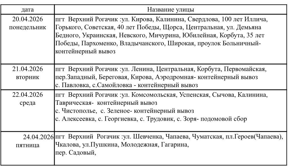 ГБУ «Экологический оператор» уведомляет Вас о графике вывоза бытового мусора в период с 20 по 24 апреля 2026 года в Верхнерогачикском муниципальном округе Херсонской области.