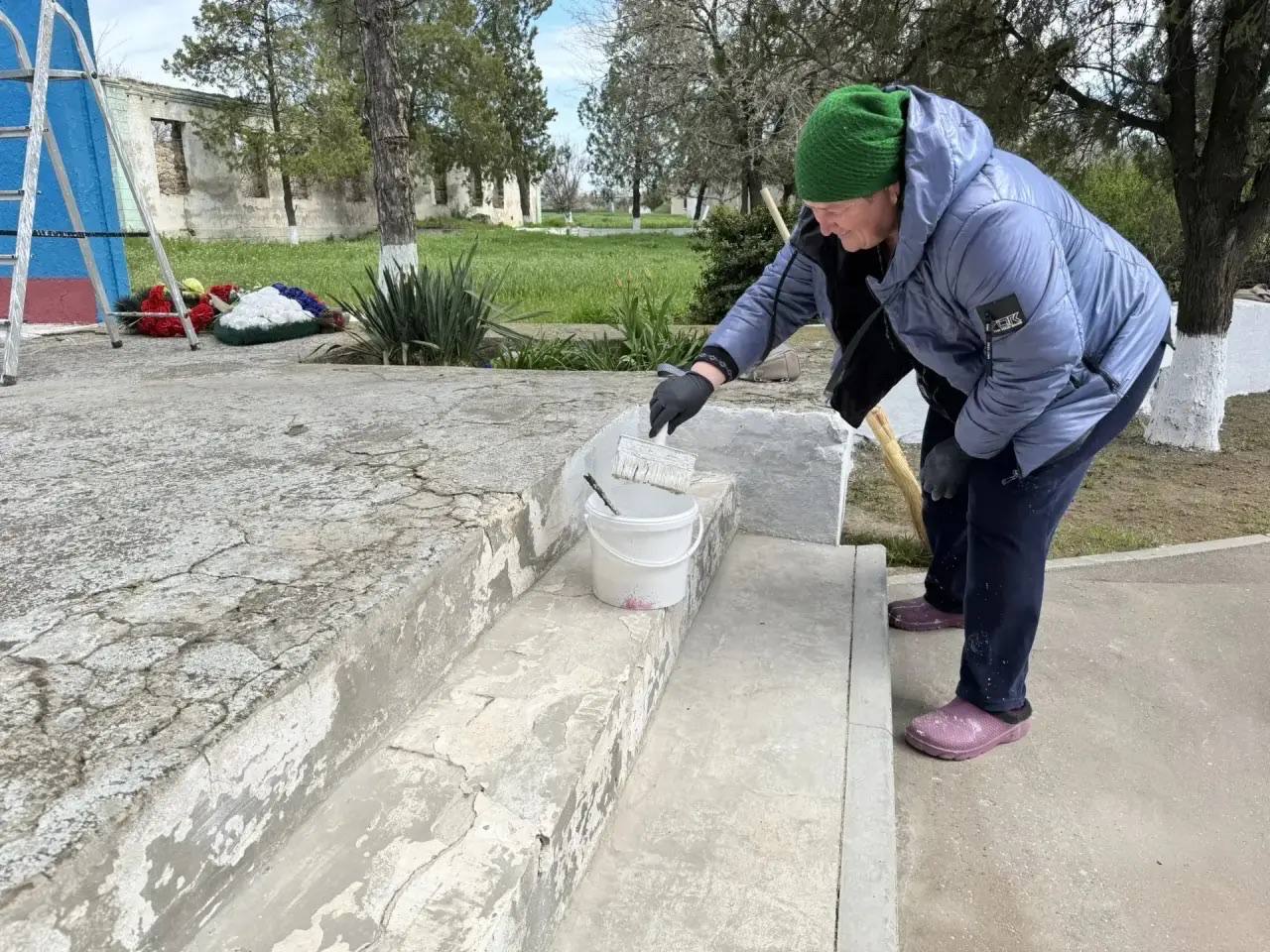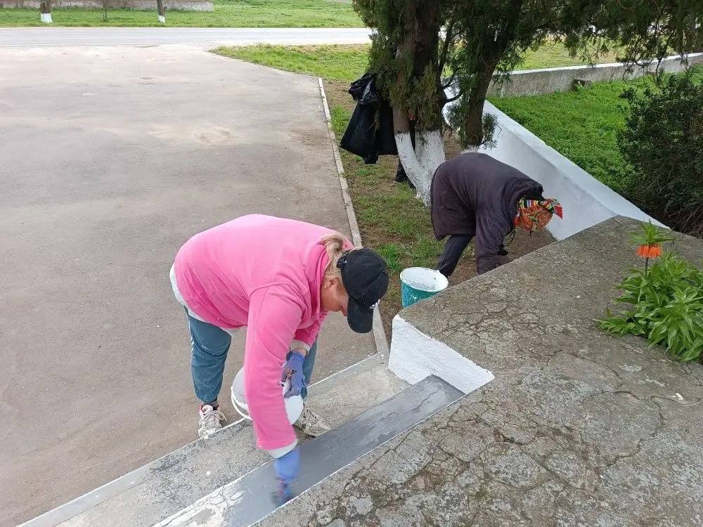 Участники субботника очистили территорию от прошлогодней листвы и мусора, подмели дорожки и привели в порядок клумбы, побелили бордюры и покрасили Обелиск.