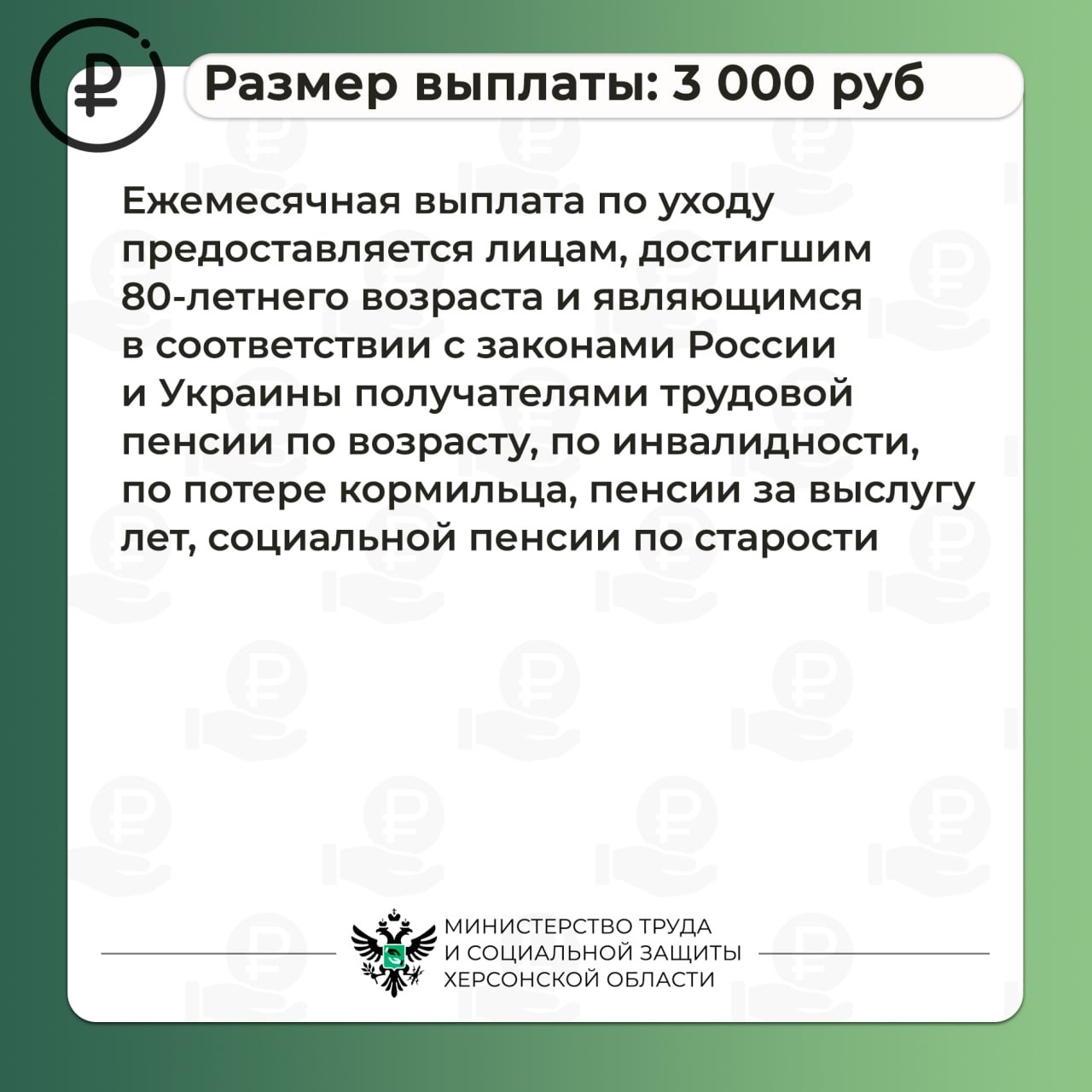 Ежемесячная выплата по уходу предоставляется лицам, достигшим 80-летнего возраста и являющимся в соответствии с законодательством Украины и Российской Федерации получателями трудовой пенсии по возрасту, по инвалидности, по потере кормильца, пенсии за выслугу лет, социальной пенсии по старости.