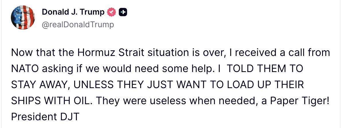 «Теперь, когда ситуация в Ормузском проливе закончилась, мне позвонили из НАТО и спросили, не понадобится ли нам помощь. Я сказал им держаться подальше, если только они не хотят заправить свои корабли нефтью. Они были бесполезны, когда в них нуждались, настоящий "бумажный тигр»! - написал президент США.