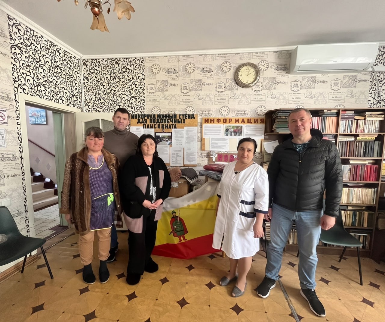 Во время визита передали для нужд пансионата постельные принадлежности, посуду, канцтовары и настольные игры.