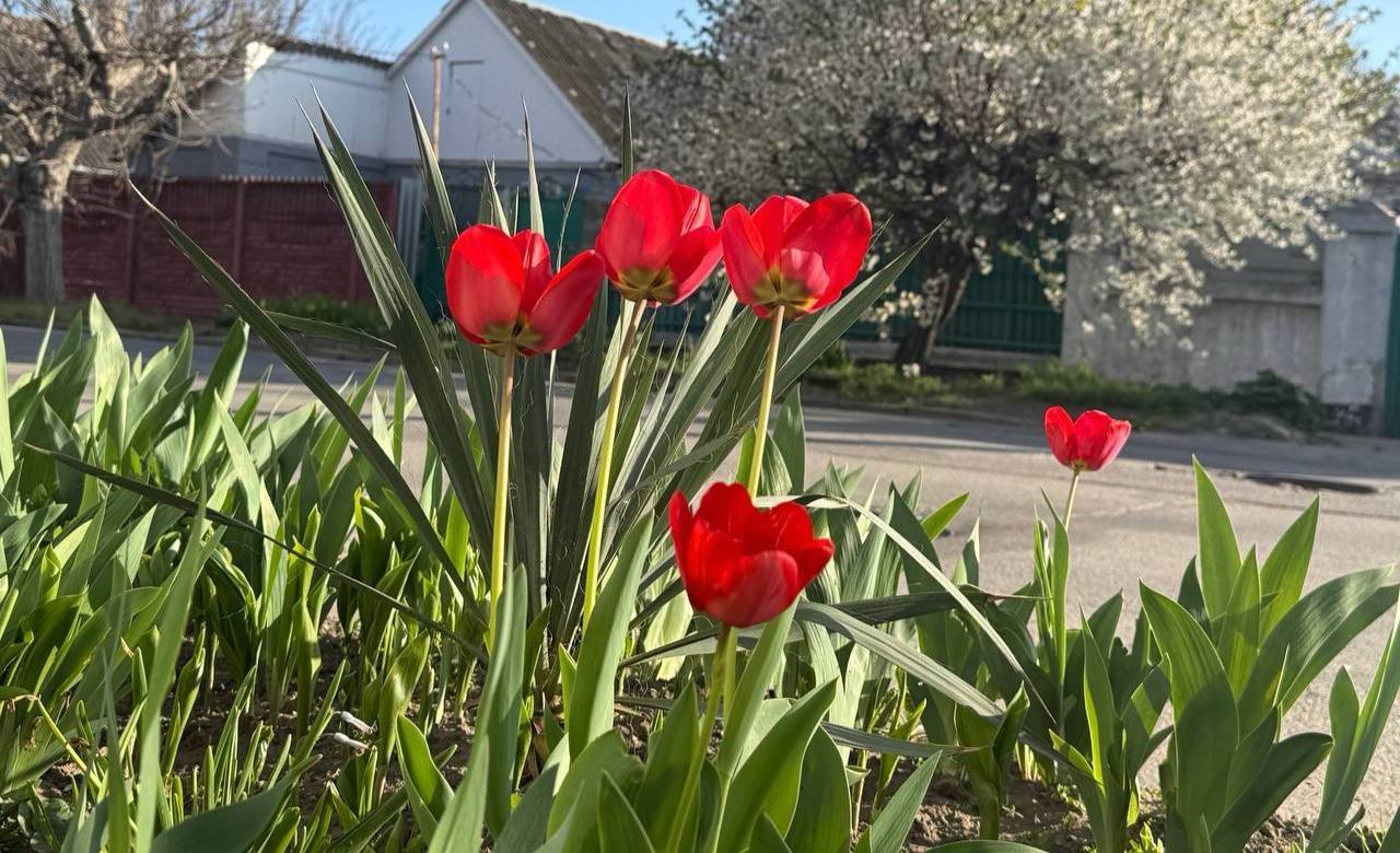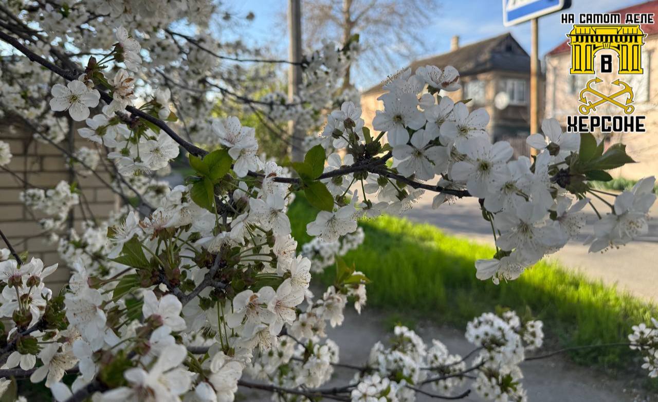 Белый цвет и весеннее солнце на Черноморской в Херсоне. Ухоженная и украшенная цветами улица, замершая в ожидании возвращения своих людей.