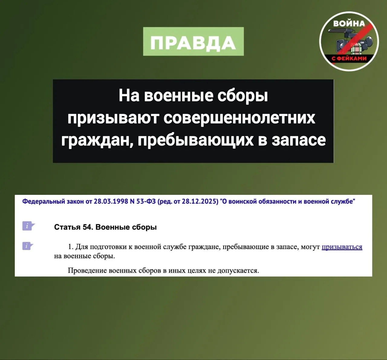 Правда: Пропагандисты вводят в заблуждение своих подписчиков. Согласно статье 54 закона о «Воинской обязанности и военной службе», на военные сборы могут быть призваны совершеннолетние граждане, пребывающие в запасе: