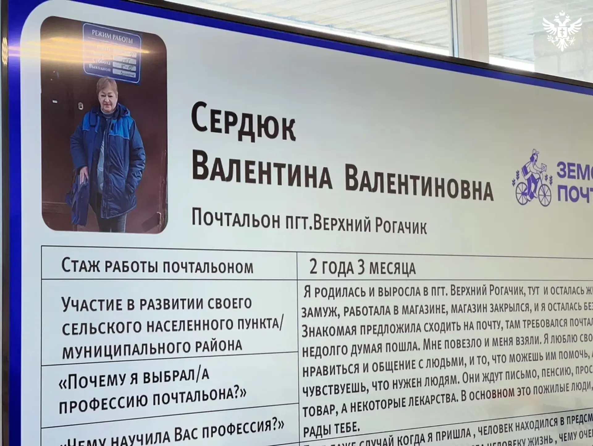 За плечами Валентины Сердюк — более 20 лет работы в почтовой службе. Начав свой путь после закрытия магазина, где она трудилась раньше, Валентина Валентиновна быстро поняла: почта для сельчан — это не просто услуги, а часто единственная связь с большой землёй.