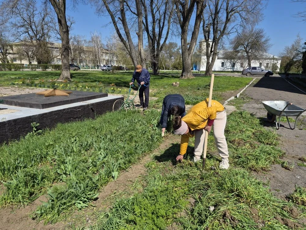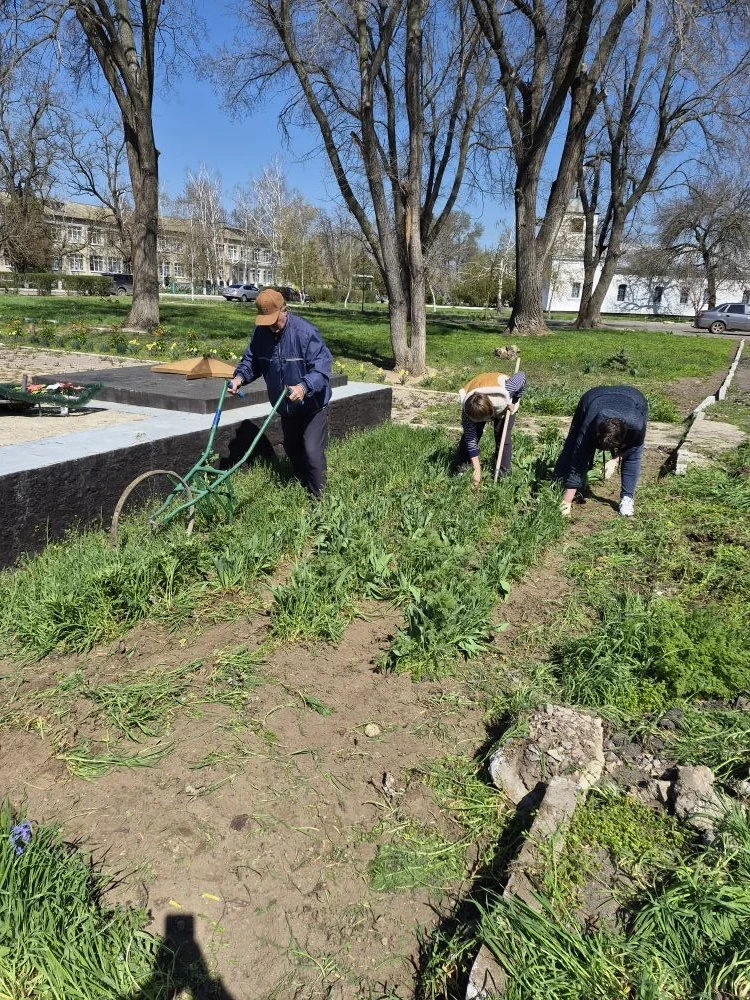 Они очистили прилегающую территорию от травы и сорных растений, подмели дорожки и площадку перед монументом, а также привели в порядок клумбы и газон возле памятника.