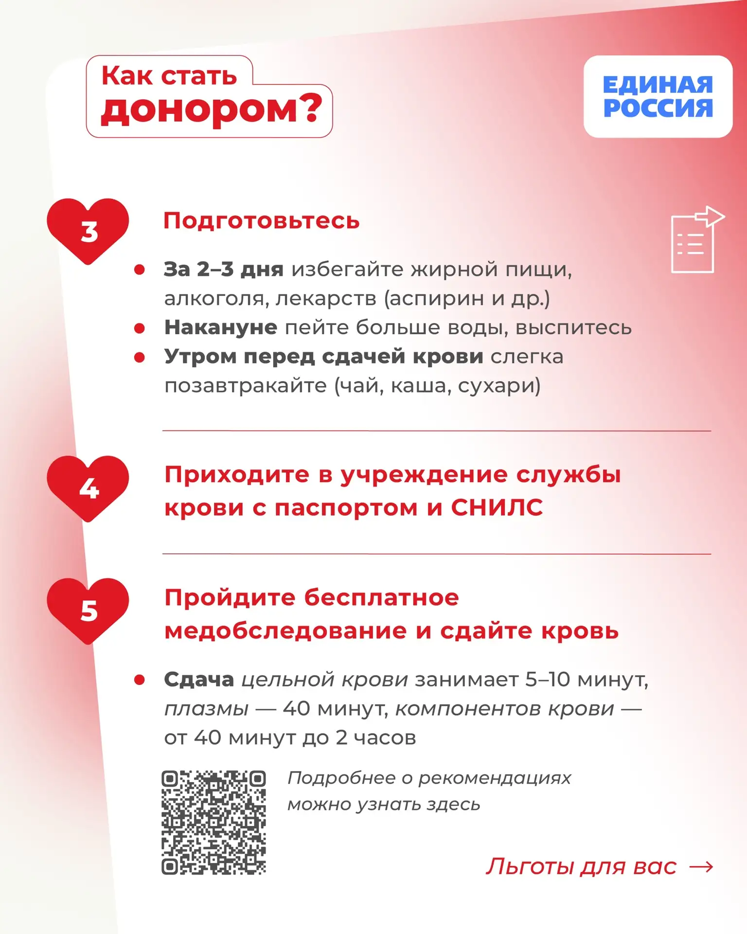 Многие откладывают момент донорства крови, потому что не знают, с чего начать. Мы подготовили понятные карточки — в них всё, что важно знать перед сдачей крови.