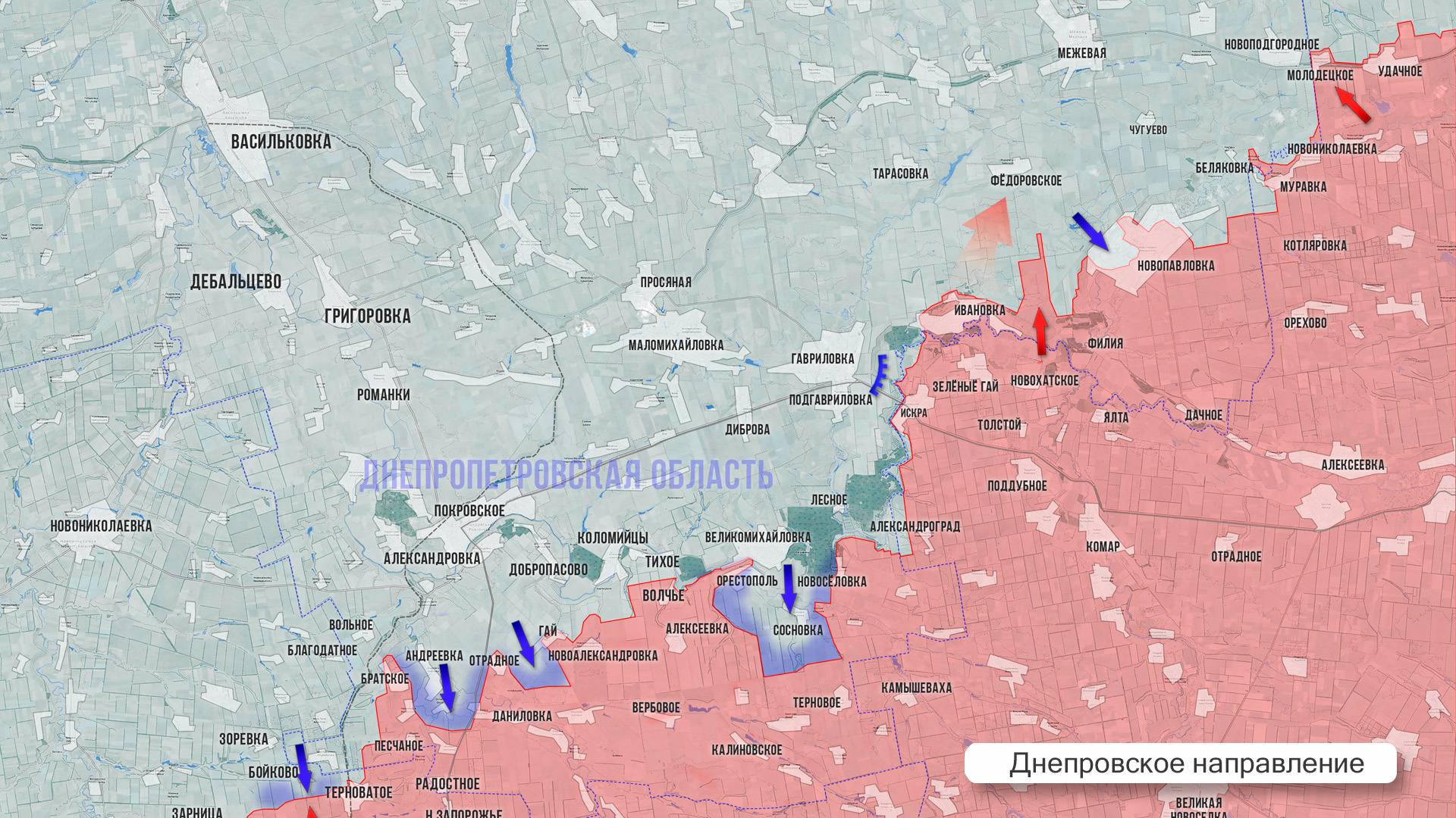 На Днепровском направлении ВС РФ наносят систематические удары дронами по позициям врага и ПВД по всей линии Александровка-Коломейцы-Великомихайловка. К северо-западу от Александрограда продолжаются интенсивные бои в лесу между реками Волчья и Каменка в направлении на с. Лесное.