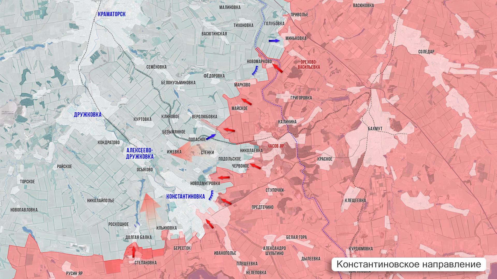 На Константиновском направлении ВС РФ зачистили «карман» к югу от трассы Красноармейск-Артёмовск в районе Берестка. В районе Долгой Балки и Ильиновки продолжаются бои. Тяжёлое сражение идет в центральной части Константиновки и на восточных окраинах, где ВСУ пытаются удержать частный сектор, но единой линии обороны там уже нет, противник держит ряд узлов.