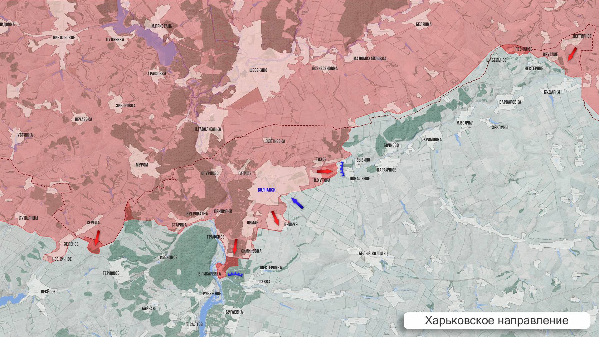 На Харьковском участке ВС РФ расширяют плацдарм вдоль границы к востоку от Волчанска. Бои идут в районе с. Бочково, и на северных окраинах Охримовки и в лесах севернее. В Покаляном встречные стрелковые бои, по позициям врага в Зыбино работают операторы дронов и артиллерия.