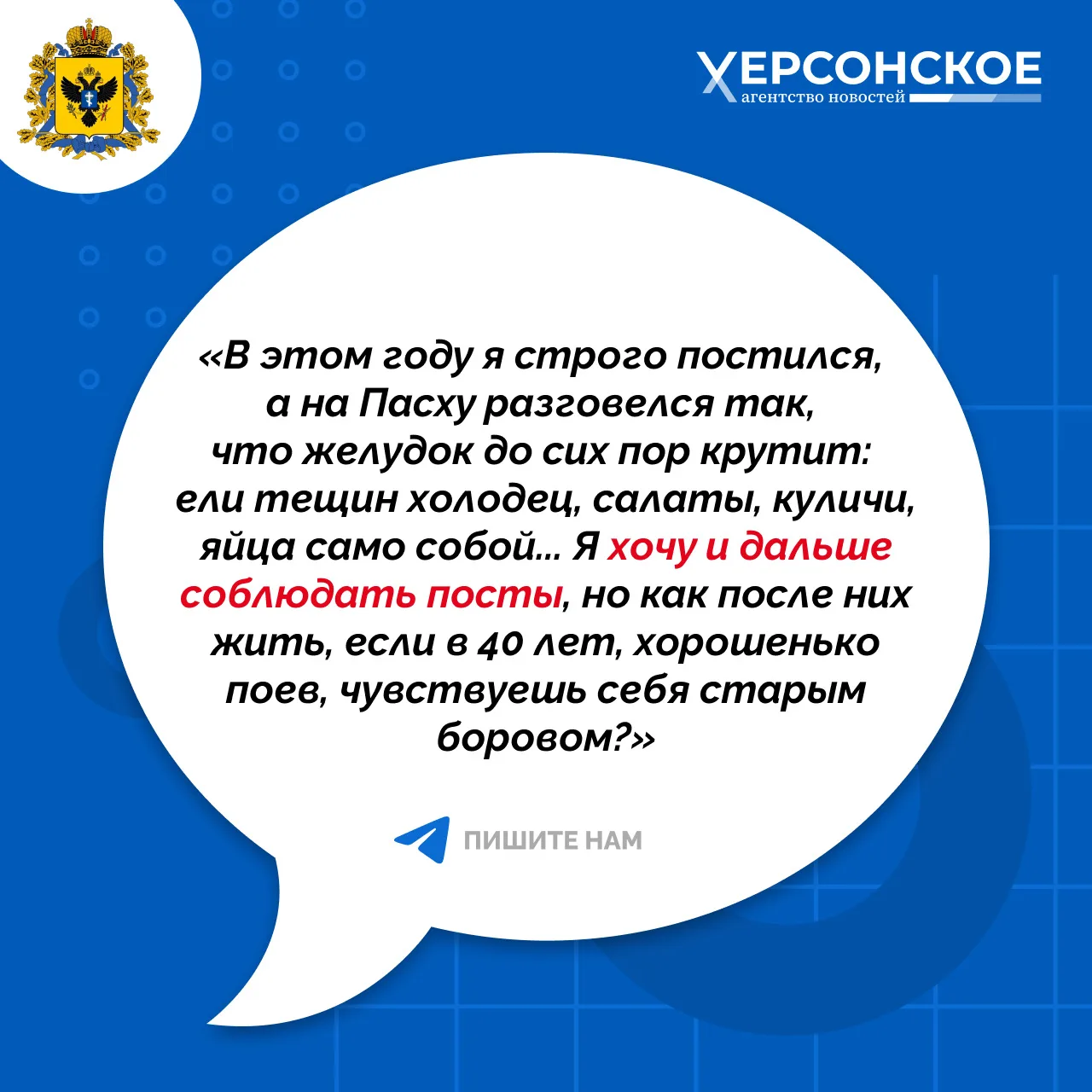 «В этом году я строго постился, а на Пасху разговелся так, что желудок до сих пор крутит: ели тещин холодец, салаты, куличи, яйца само собой... Я хочу и дальше соблюдать посты, но как после них жить, если в 40 лет, хорошенько поев, чувствуешь себя старым боровом?»
