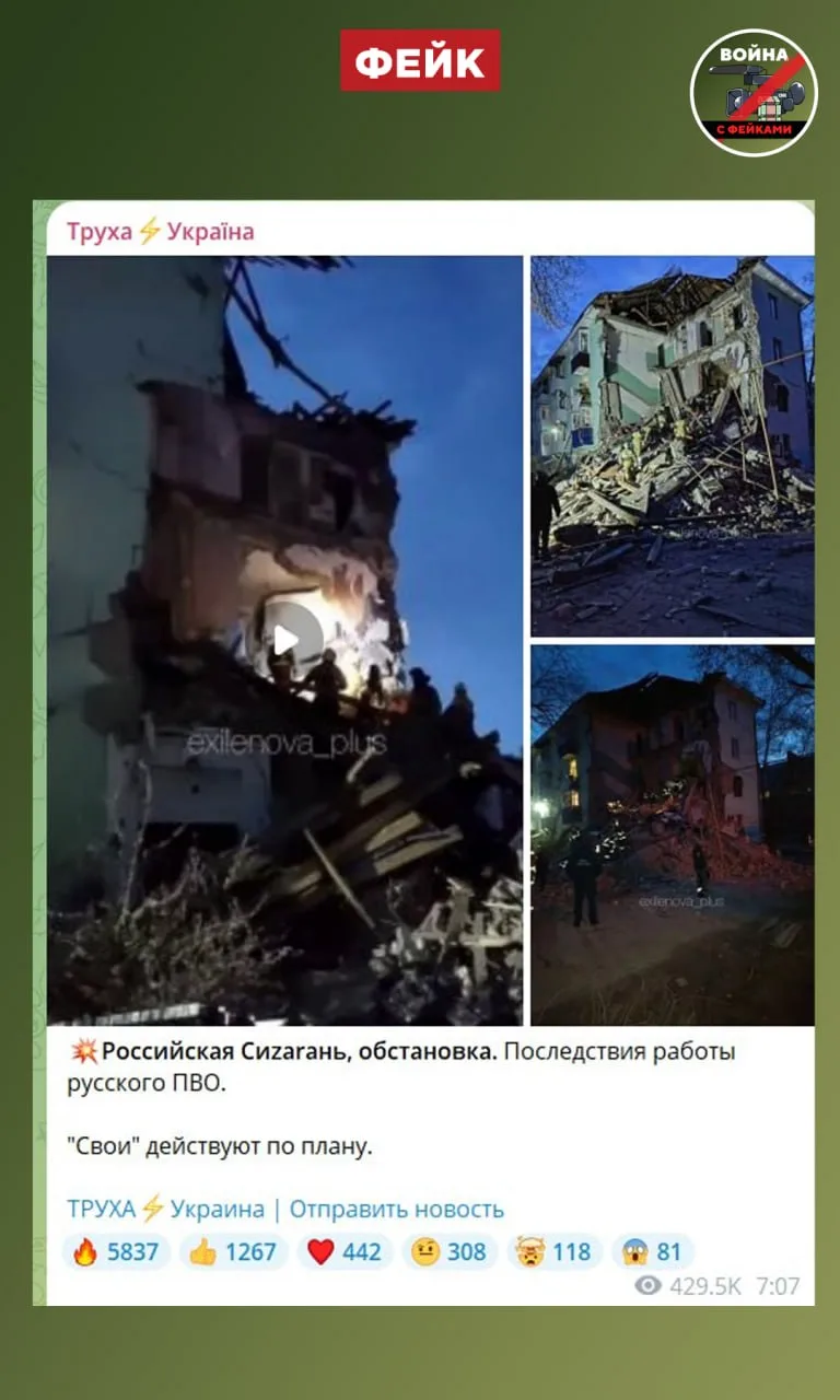 Фейк: В результате работы ПВО ВС РФ в Сызрани обрушился подъезд многоквартирного дома