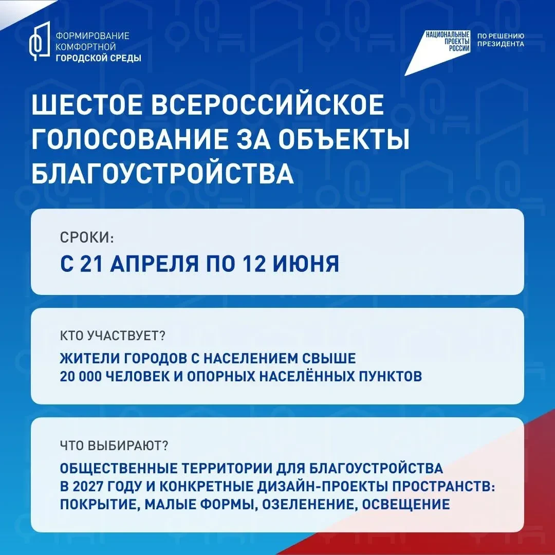 Голосование проводится в рамках федерального проекта «Формирование комфортной городской среды» национального проекта «Инфраструктура для жизни».