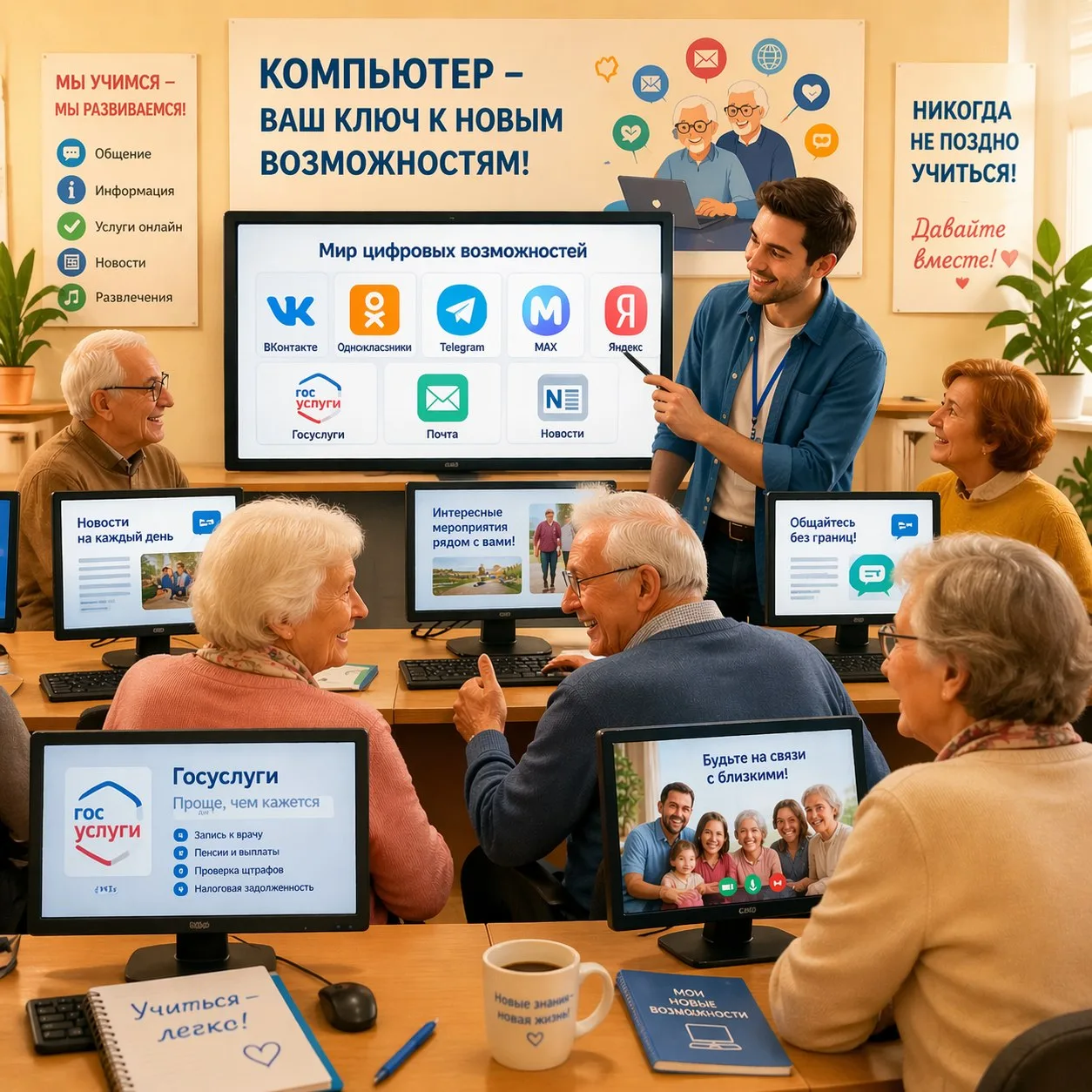 Курс цифровой грамотности позволит людям старшего возраста свободно пользоваться компьютерной техникой и гаджетами. Получать госуслуги через интернет. Иметь доступ к соцсетям и сайтам. Общаться с родственниками и друзьями через мессенджеры и электронную почту.
