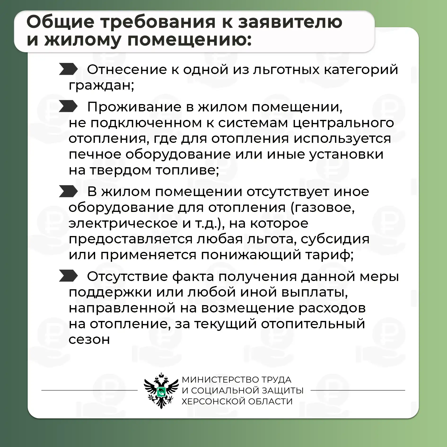 Основание: Постановление Правительства Херсонской области от 19.01.2026 № 01-пп «О мере социальной поддержки (в денежном выражении) на приобретение твердого бытового топлива гражданам отдельных категорий, проживающим на территории Херсонской области».