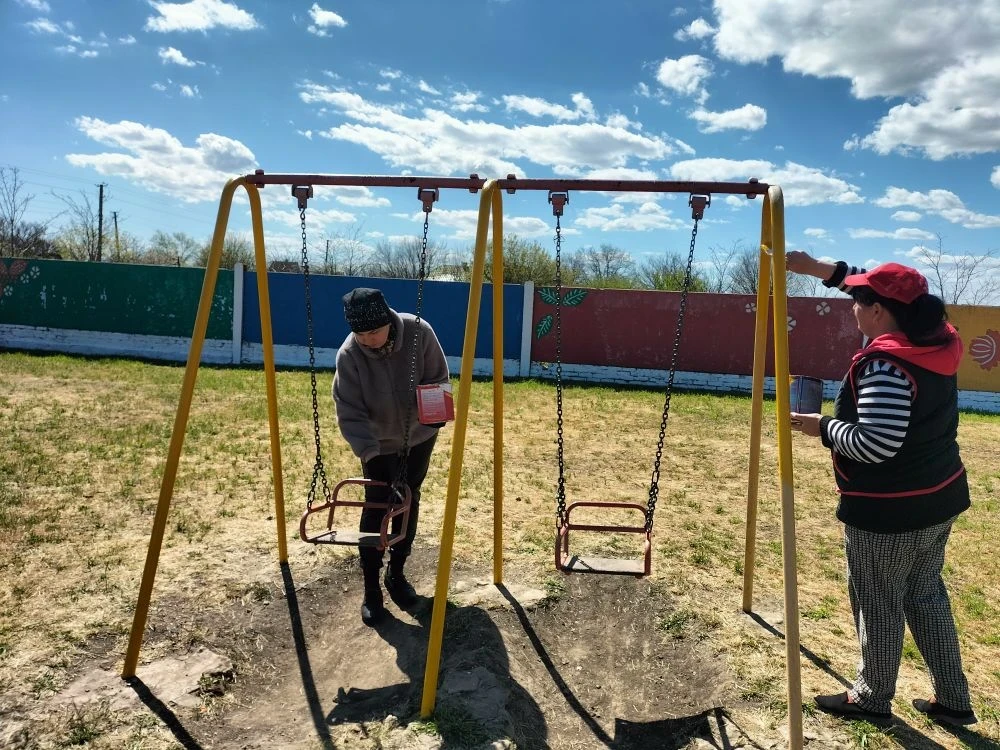 Покрасили качели и малые архитектурные формы – теперь площадка выглядит ярко и обновленно.