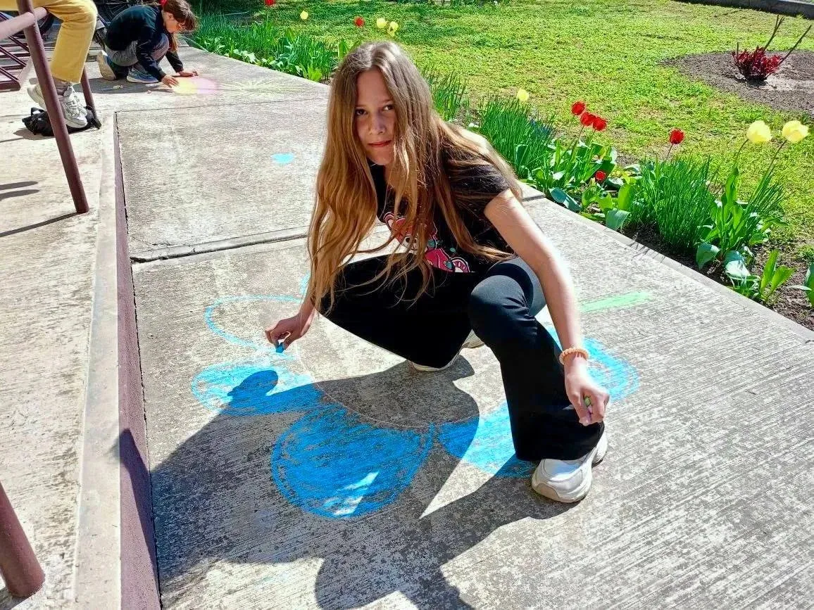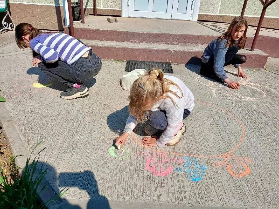 Дети с большим увлечением создавали свои рисунки прямо на улице, старались аккуратно раскрашивать и точно передавать задуманное. Асфальт на время превратился в большое общее полотно, где у каждого нашлось своё место.