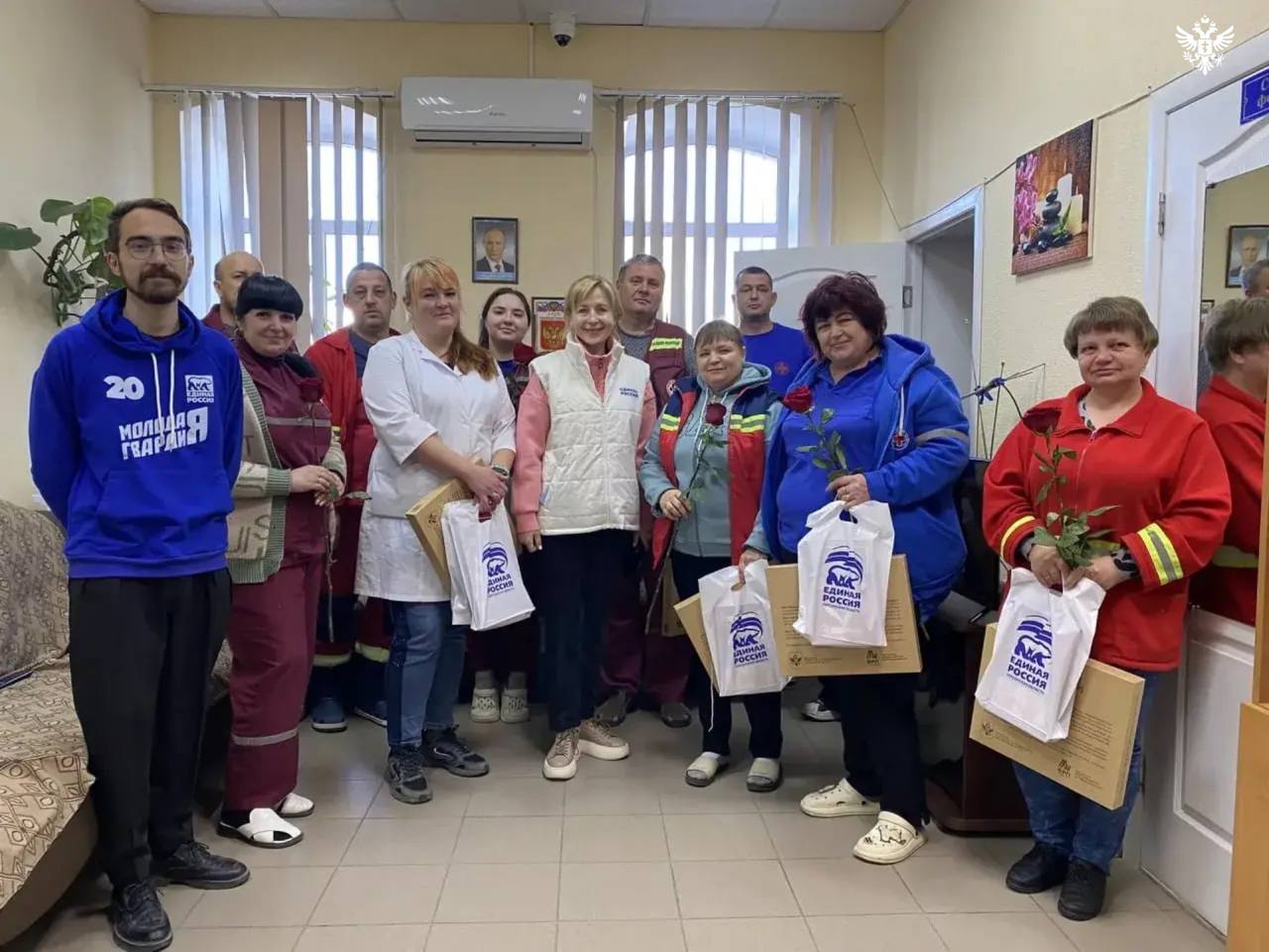 Праздничные мероприятия прошли и на местах. Так, в Геническе на местной станции скорой помощи, где трудятся 73 человека — фельдшеры, врачи, диспетчеры и водители, — представители «Единой России» поздравили коллектив. Участница предварительного голосования партии Елена Дмитрук вместе с волонтёрами «Молодой Гвардии» вручили медикам подарки и цветы.