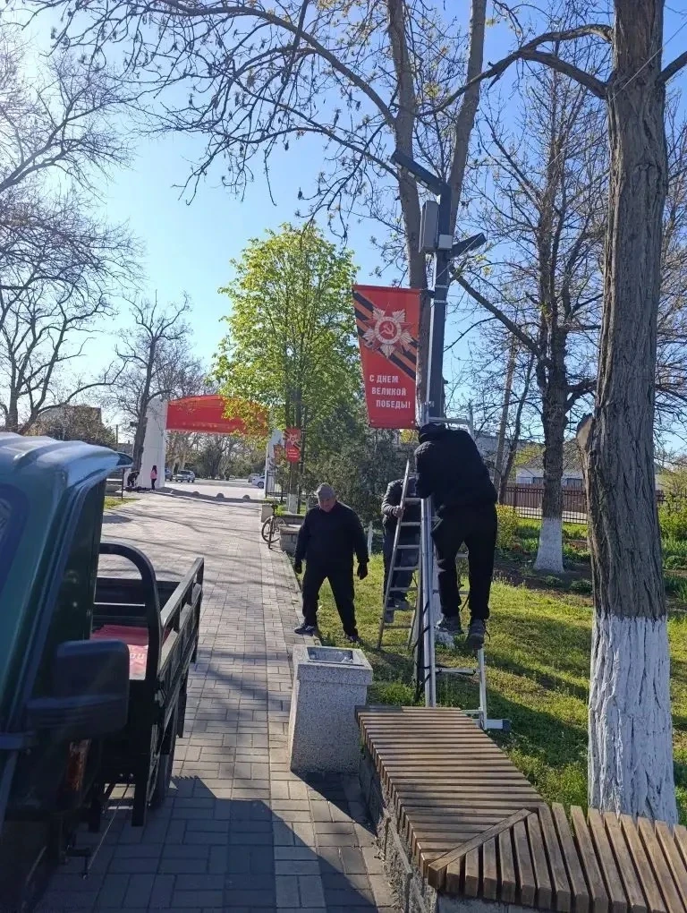Размещение праздничных баннеров ко Дню Победы на опорах освещения.