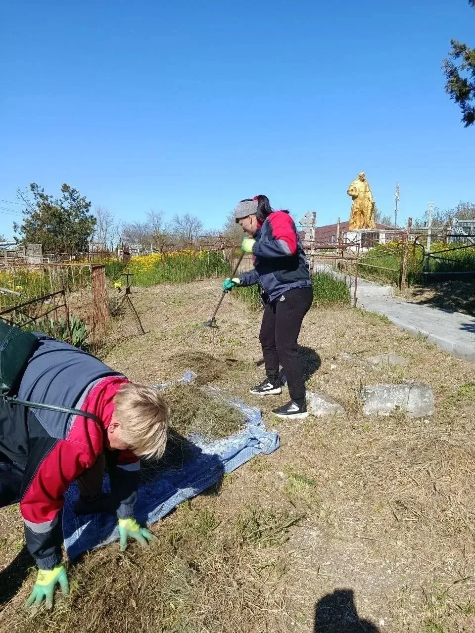 Покос травы и уборка мусора на территории кладбища.