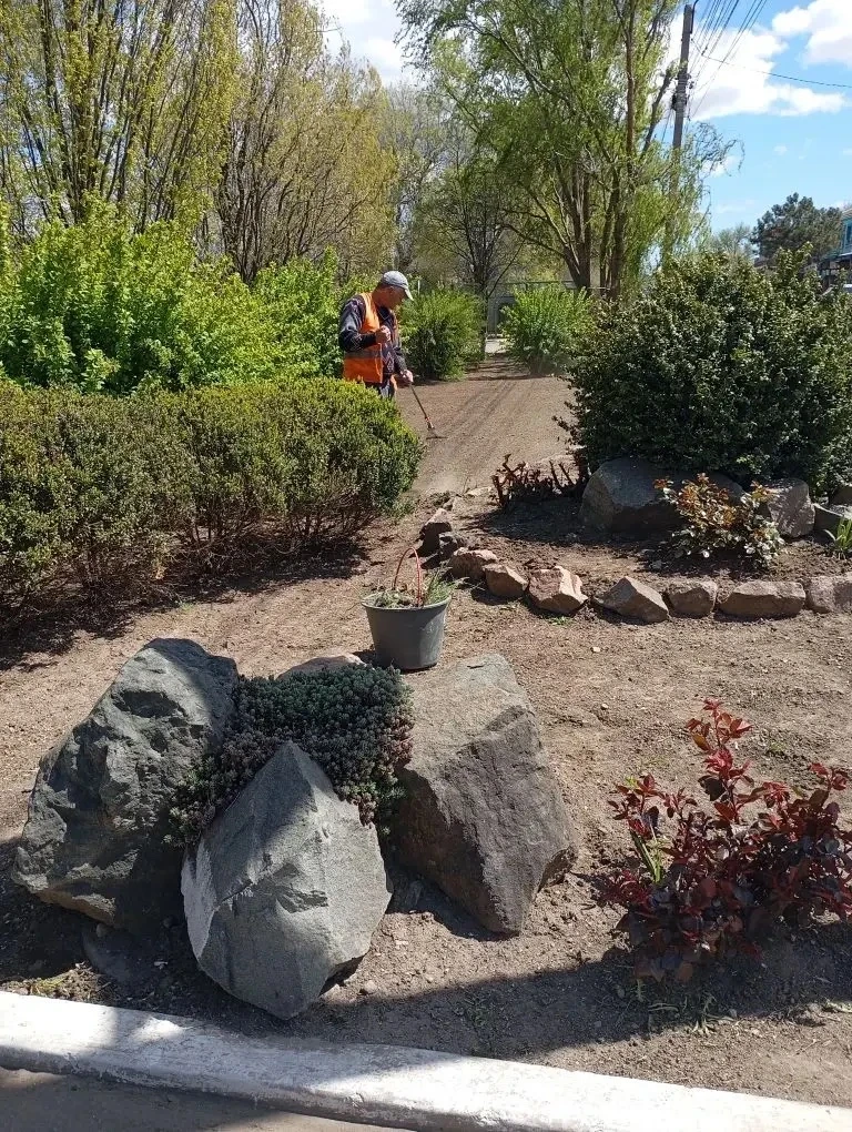 Прополка клумб на центральной аллее.