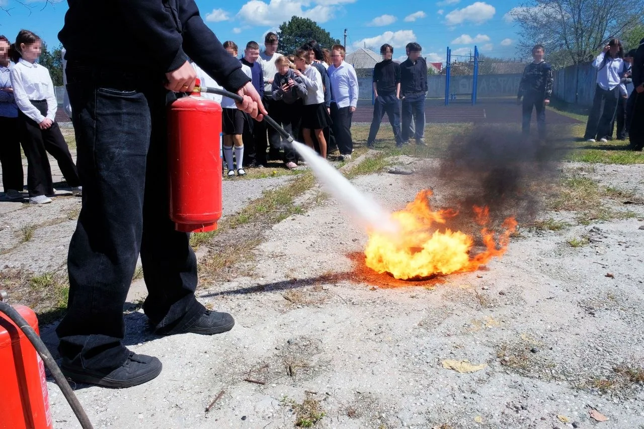 Инспектор рассказал детям о частых причинах возгораний в быту и алгоритме действий при пожаре. Затем школьники под контролем специалистов попробовали потушить учебный очаг возгорания с помощью порошкового огнетушителя.