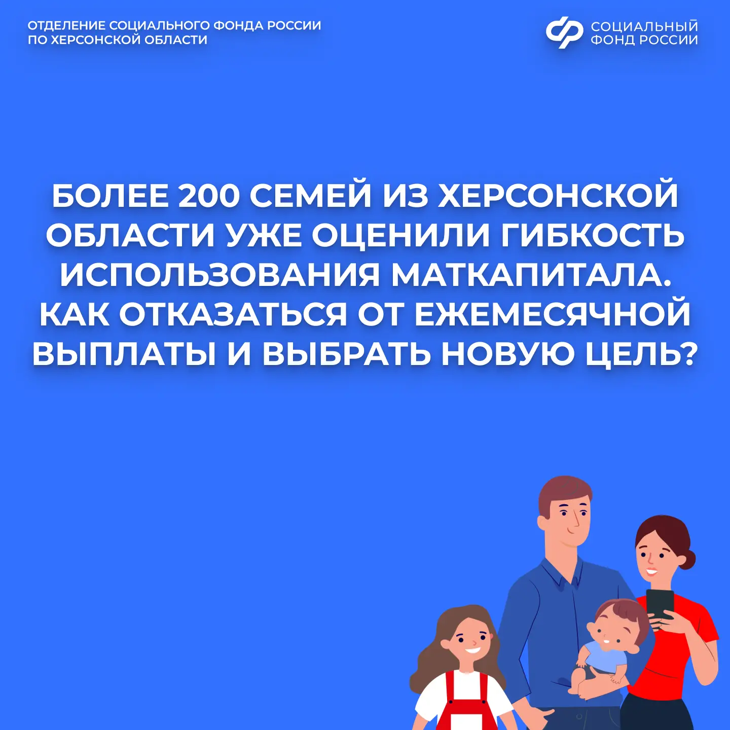 Если ваша семья в Херсонской области сейчас получает ежемесячную выплату из материнского капитала на ребенка в возрасте до 3 лет, от нее можно отказаться в любой момент. Обычно это делают, когда принимают решение направить средства на другую цель, предусмотренную законом, например, на погашение ипотеки, ремонт жилья или оплату образования ребенка.